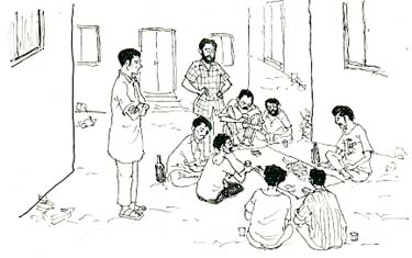 গোবিন্দ বসে আছে নিজের নোংরা, ছেঁড়া বিছানায়--সেটার আবার একপাশে খানিকটা জায়গায় শুকিয়ে যাওয়া বমির দাগ। পাঁচুকে সেই বিছানায় বসতে বলা--মুশকিলের ব্যাপার, খুবই মুশকিল।