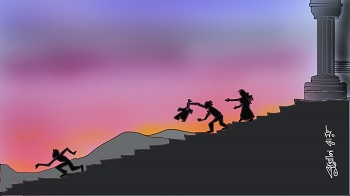 সিংহগড়ে ওরা যখন গিয়ে পৌঁছোল বেলা পড়ে আসছে। গাড়ি পার্কিং থেকে ষাট সত্তরটা সিঁড়ি ভাঙলেই পাহাড়ের চূড়ায় পৌঁছে যাওয়া যায়। ওপরে উঠে দেখল চোখের সামনে খোলা আকাশ। সূর্যাস্তের বেশি দেরি নেই। তানাজি মেমোরিয়াল, কালী মন্দির দেখতে দেখতেই আলো পড়ে এল। নামার মুখেই দময়ন্তী হোঁচট খেল, একটা পাথর বেমক্কা উঁচু হয়ে ছিল। বিশেষ লাগেনি যদিও এক মুহূর্ত থমকে দাঁড়াল। জয়ন্ত এক ধাপ ওপরে ছিল, জিজ্ঞেস করল, “কী হল?”
