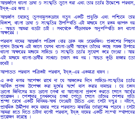 The primary reason for publishing the internet magazine, (or webzine) Parabaas, was to provide, for the nearly twenty thousand Bengali speaking netizens, an easy way to cultivate Bengali literature in the Bengali script.