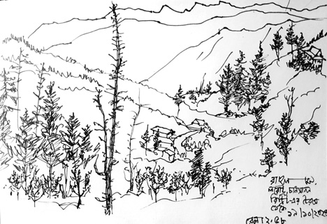 শিলাদেশ হয়ে নদী পেরিয়ে টিক্করী এলো পৌনে এগারোটায়, দশ মিনিটে চিড়গাঁও। সাড়ে এগারোটায় রোহড়ুকেও পেরিয়ে গেল বুড়োবুড়ির গাড়ি। ভরদুপুরে হাটকোঠি পেরোনোর পর চড়া রোদ এ সি গাড়ির জানালার বাইরেই তড়পে চলল। আধঘন্টা পরে ঋষভ গাড়ি দাঁড় করাল খড়াপত্থরের টুরিস্ট লজ গিরিগঙ্গার সামনে।