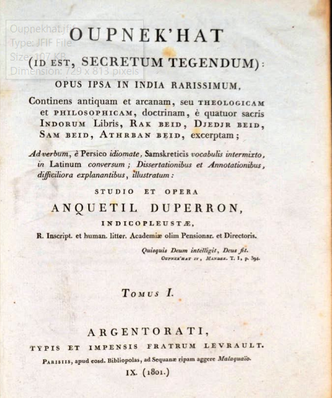 তবে এই ফরাসি প্রাচ্যবিদ শুধু আবেস্তা অনুবাদ করেই ক্ষান্ত হননি। অষ্টাদশ শতাব্দের শেষ কয়েক দশকে তিনি ইয়োরোপীয়দের উপনিষদ অধ্যয়নের প্রথম পথিকৃৎ হিসেবে আবির্ভূত হন। ১৭৩১-এ অঁক্তিল দুপেরোঁ-র জন্ম। চব্বিশ বছর বয়সে ফ্রেঞ্চ রয়্যাল লাইব্রেরির এজেন্ট হিসেবে পাণ্ডুলিপি সংগ্রহ এবং সেই সব পাণ্ডুলিপি পাঠের লক্ষ্য নিয়ে তিনি ভারতে আসেন। স্বপ্ন ছিল বারাণসীতে গিয়ে উপমহাদেশের শ্রেষ্ঠ পণ্ডিতদের কাছে সংস্কৃত শেখা। তখন পর্যন্ত এ কাজ কোনও ইয়োরোপীয় সমাধা করতে পারেনি।